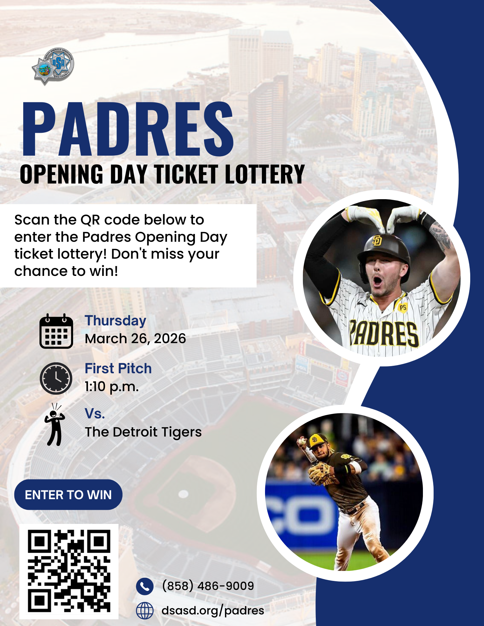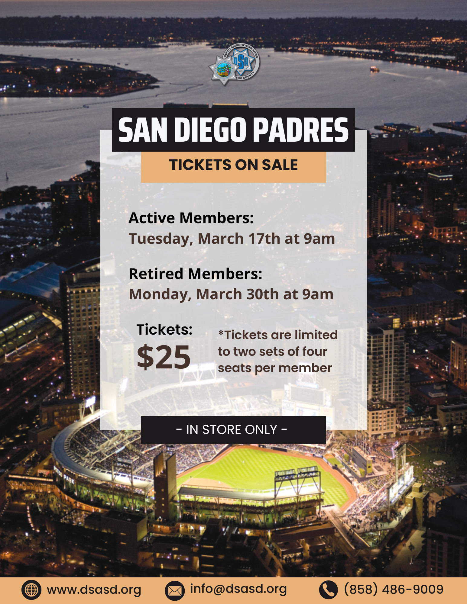 Padres tickets will go on sale for active members on Tuesday, March 17th at 9am in the DSA Store. Retired Members may purchase tickets on Monday, March 30th.